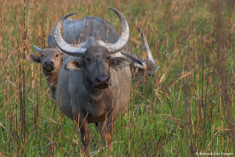 The Water Buffalo is also one of the threatened species, for which the National Park of Kaziranga is a stronghold. The Asian Wild Buffalo is a tropical to subtropical water-dependent species, which has nowadays very scattered and isolated populations all over Southern Asia. Wild populations still occur in the floodplain of the Brahamputra, which are the biggest populations nowadays (a little less then 1000 individuals). Tiny populations occur also in the East of Central India, Nepal, Bhutan, Thailand and Cambodia, in total no more then a (few) hundred individuals. Asian Wild Buffalos are herbivorous grazers and are apparently more specialised then other Asian wild cattle, given their preference for aquatic habitats. As most of the fertile floodplain species, their habitat suffered severe declines over the past centuries, and in particular the past decades. But nowadays the biggest threat to the species seems the genetic purity of the few remaining individuals because of interbreeding with the domestic forms. Other threats include the ongoing habitat degradation, as well as loss and fragmentation of their preferred wetland habitats, poaching and disease transmission with domestic cattle. The Asian Wild Buffalo is now classified by IUCN as Endangered.