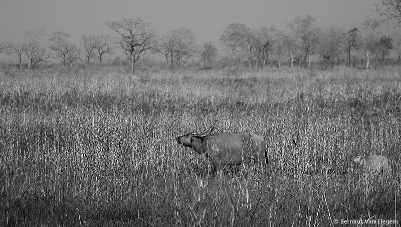 The Water Buffalo is also one of the threatened species, for which the National Park of Kaziranga is a stronghold. The Asian Wild Buffalo is a tropical to subtropical water-dependent species, which has nowadays very scattered and isolated populations all over Southern Asia. Wild populations still occur in the floodplain of the Brahamputra, which are the biggest populations nowadays (a little less then 1000 individuals). Tiny populations occur also in the East of Central India, Nepal, Bhutan, Thailand and Cambodia, in total no more then a (few) hundred individuals. Asian Wild Buffalos are herbivorous grazers and are apparently more specialised then other Asian wild cattle, given their preference for aquatic habitats. As most of the fertile floodplain species, their habitat suffered severe declines over the past centuries, and in particular the past decades. But nowadays the biggest threat to the species seems the genetic purity of the few remaining individuals because of interbreeding with the domestic forms. Other threats include the ongoing habitat degradation, as well as loss and fragmentation of their preferred wetland habitats, poaching and disease transmission with domestic cattle. The Asian Wild Buffalo is now classified by IUCN as Endangered.