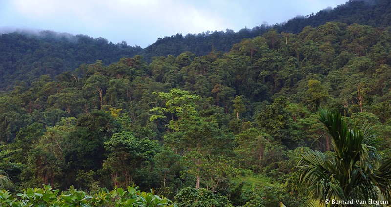 This picture was taken just behind Wailebed Village. On the foreground there is a small belt of secondary forest. Behind the first tree lines, the pristine fprimaray forest starts on the steep hill slopes.