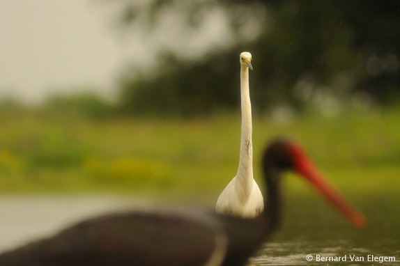 On the foreground, one can see a Black Stork, Ciconia nigra, passing by.