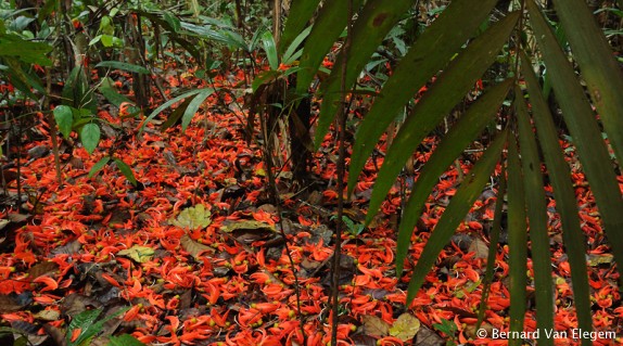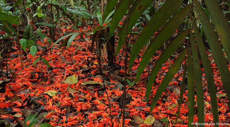 This picture was made in the swamp forest, close to Jamil's house in Nimokrang. In some areas a vine species was abundantly flowering. A full-grwon vine holds thousands of red fleshy flowers, which attracted a lot of parrots. At the end of my stay, and after some heavy rainfall, most of the flowers had dropped down. The forest floor colored completely red, giving the forest an enchanted aspect.