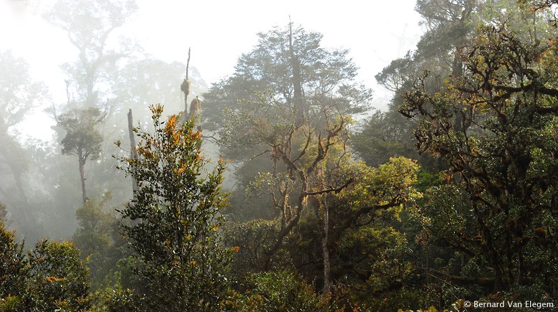 This picture, shows the view I had form my tent at Yabogima. In the early morning, when the sun pierced through the clouds and fog, this resulted in a magical view of the surrounding forest.