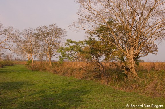 Kaziranga is one of the most important wetland areas in the floodplain of the Brahmaputra river. It consists of a natural mix of deciduous forests, grasslands, marshes, swamps, lakes and pools. The grasslands are held partially open by the huge amount of large grazers, such as several deer species, Indian rhino's, elephants and water buffalo's. The park is the stronghold for some of these threatened wetland species, such as the Water Buffalo, Swamp Deer and Indian Rhino, of which the world's largest populations are found within the park. Because of this, each year some of the elephant grass grasslands are burnt by the local park managers and rangers, to prevent them from a natural evolution to shrubbery and forest. With the local grazing pressure, helped by the burning of grasslands, the amount of vast open grasslands is kept more or less stable (which is 60 - 70 % of the park). Apart from the mentioned grazers the park is also a stronghold for plenty of other threatened wetland species, of which numerous bird species, such as the Greater and Lesser Adjudant, Spot-billed Pelican, Pallas' Fish Eagle, Slender-billed Vulture, Jerdon's Babbler, Black-breasted Parrotbill and many mammal species, such as Sloth Bear, Tiger, Leopard and Fishing cat.