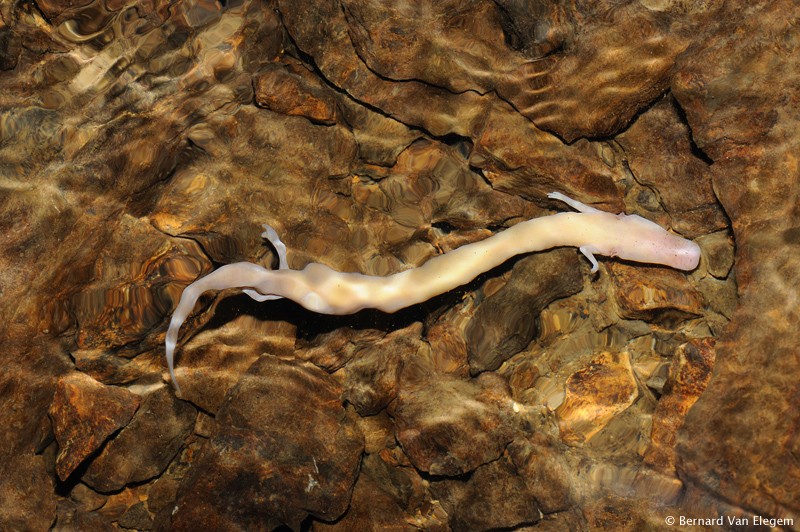 This picture was made at Planinksa Jama, a place where the biggest known population of Olms occurs. They live in the huge riverine cave ecosystem of Planinska, which is connected to the famous Postojna Cave, which is classified as a World Heritage Center. The olms are extremely weird cave dwelling creatures who spend their entire life in tha caves. Only after exceptional heavy rainfall and and floodings, they sometimes reach the surface and can be found outside caves. This is how the first specimen was encountered in 1751 after severe floodings. The species was then described as a fish, which explains it's original english name, the 'human fish'. As most of the exclusive cave organisms they have no pigmentation and they are blind. The genus 'proteus' only occurs in the Eastern and Central part of North America and the East-Adriatic Karst region. Proteus anguineus is only found in a small area in Italy and the karst region of Slovenia and Croatia. They only live in slow-flowing and oxygen-rich cave streams, where they mainly live in quiet and blind riverarms. They mainly feed on invertebrata, such as the water woodlouse and small crustacea, and they can survive for long periods without food.
