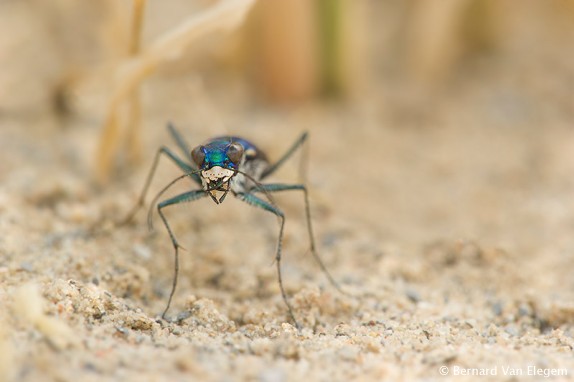 When it becomes very hot and the sand reaches very high temperatures, these Tiger Beetles start hunting under the vegetation, where most of their prey tend to hide as well during the hottest parts of the day. On this iamge one can clearly see the specimen is hiding in the shadow of the vegegation cover.