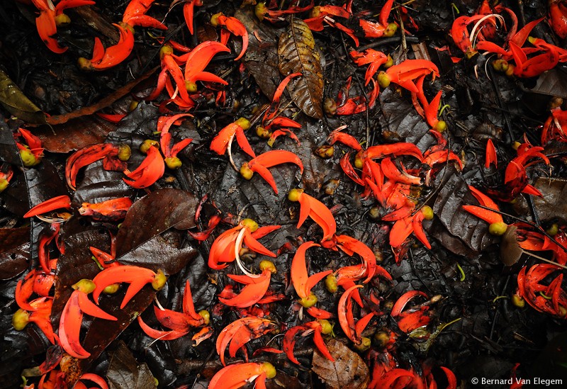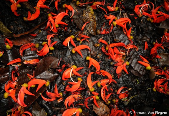 This picture was made in the swamp forest, close to Jamil's house in Nimokrang. In some areas a vine species was abundantly flowering. A full-grwon vine holds thousands of red fleshy flowers, which attracted a lot of parrots. At the end of my stay, and after some heavy rainfall, most of the flowers had dropped down. The forest floor colored completely red, giving the forest an enchanted aspect. When taken a closer look at the flowers, they look like fallen angels or fallen birds.
