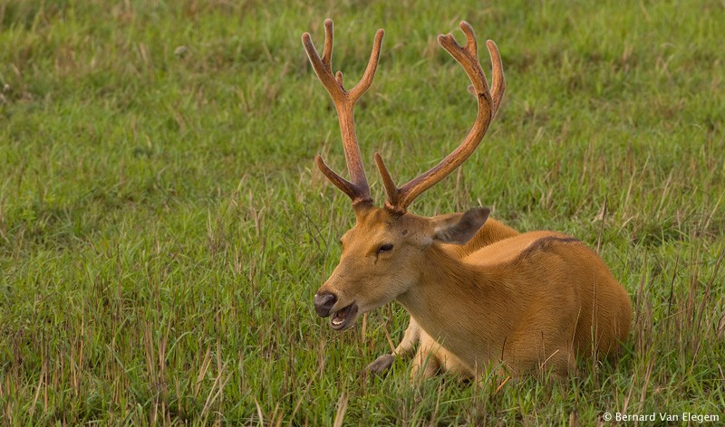 The Swamp Deer or Barsingha, holds three subspecies, one ocurring in Central India, a second one in the wetlands of Nepal, and a third one 'rajitsinhi', ocurring in the Eastern floodplains of the Brahmaputra. This is the subspecies 'ranjitsinhi', for which Kaziranga is a stronghold. The entire population of Kaziranga is estimated at about 500 individuals. The species has suffered huge declines, as a lot of the wetland species in India did during the past decades, due to the loss of habitat in the fertile alluvial floodplains. Outside the protected ares, the species still suffers from competition with livestock, poaching and habitat degradation. The species is now classified as Vulnerable on the IUCN Red List.