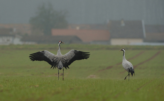 The Lac Du Der has become one of the most important roosting sites in Western Europe for the Common Crane during the migration periods. In November and in februari-march, up to 70.000 Common Cranes come to sleep at this huge artificial lake, which serves as a drinking water reservoir for the Isle de Paris. During the previous decades, the number of wintering birds kept on increasing. Nowadays the site holds also important numbers of wintering Cranes. Up to 10.000 Common Cranes are feeding during most of the winter in the fields and meadows around the lake. Apperently the birds found out that there is still a lot of food for them in the agricultural land around the lake. Despite the fact that the winters can be quite chilly up there, the food weights up against a long voyage to their traditional wintering grounds in Spain and Morocco.